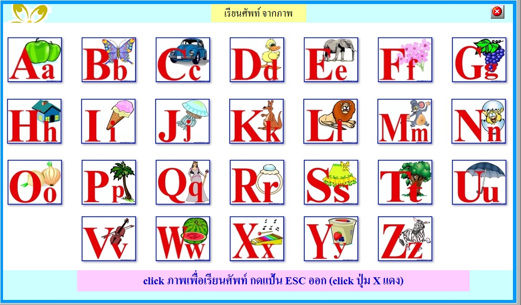 ผู้ใช้ click เลือก ตัวอักษรที่ตัองการเรียนรู้ โปรแกรมจะแสดง ศัพท์ พร้อมเสียงอ่าน